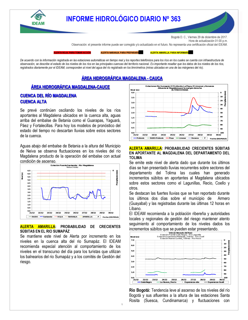 En general, el seguimiento que hace el Ideam del comportamiento hidrológico en los principales ríos del país se realiza con la información horaria en tiempo real que se recibe de las estaciones automáticas, complementadas con más de 40 estaciones hidrológicas que transmiten en las primeras horas cada mañana, los 365 días del año.