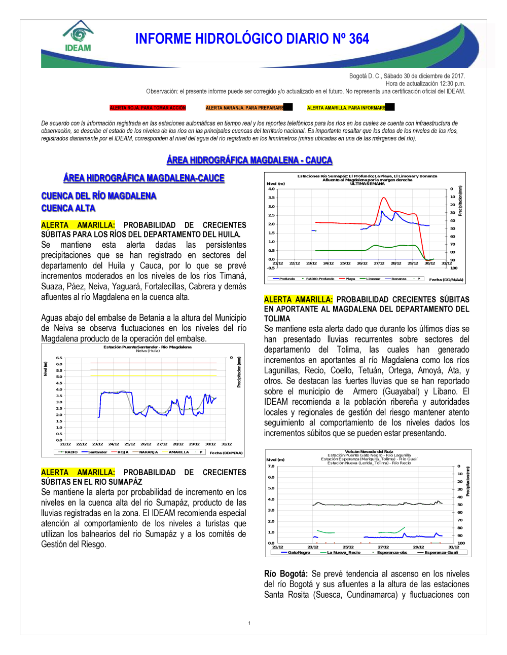 En general, el seguimiento que hace el Ideam del comportamiento hidrológico en los principales ríos del país se realiza con la información horaria en tiempo real que se recibe de las estaciones automáticas, complementadas con más de 40 estaciones hidrológicas que transmiten en las primeras horas cada mañana, los 365 días del año.