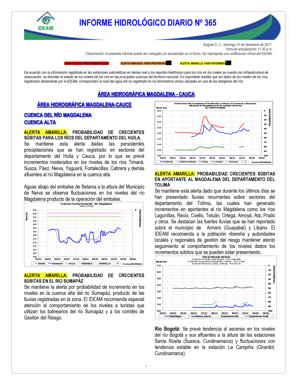 En general, el seguimiento que hace el Ideam del comportamiento hidrológico en los principales ríos del país se realiza con la información horaria en tiempo real que se recibe de las estaciones automáticas, complementadas con más de 40 estaciones hidrológicas que transmiten en las primeras horas cada mañana, los 365 días del año.
