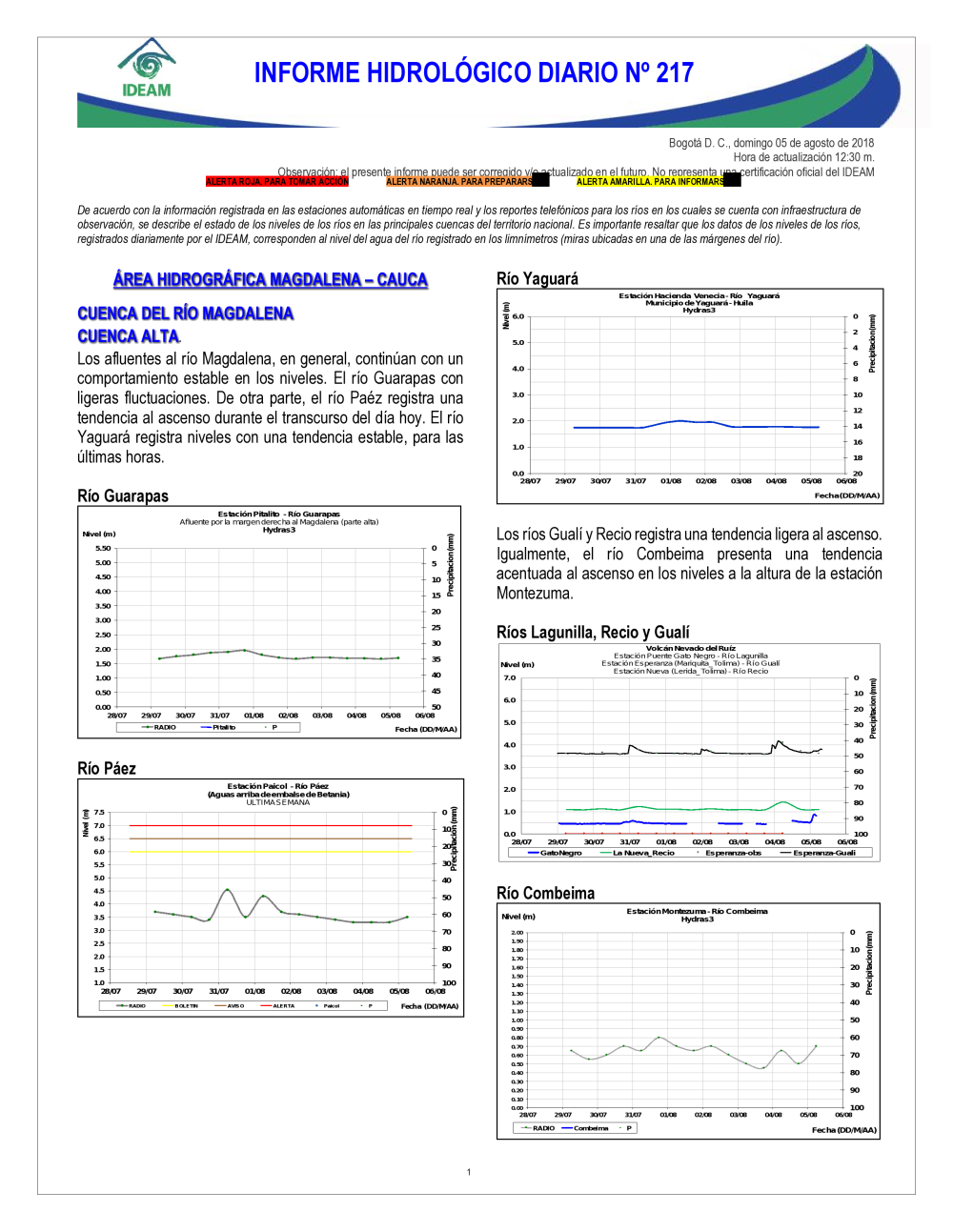 En general, el seguimiento que hace el Ideam del comportamiento hidrológico en los principales ríos del país se realiza con la información horaria en tiempo real que se recibe de las estaciones automáticas, complementadas con más de 40 estaciones hidrológicas que transmiten en las primeras horas cada mañana, los 365 días del año.