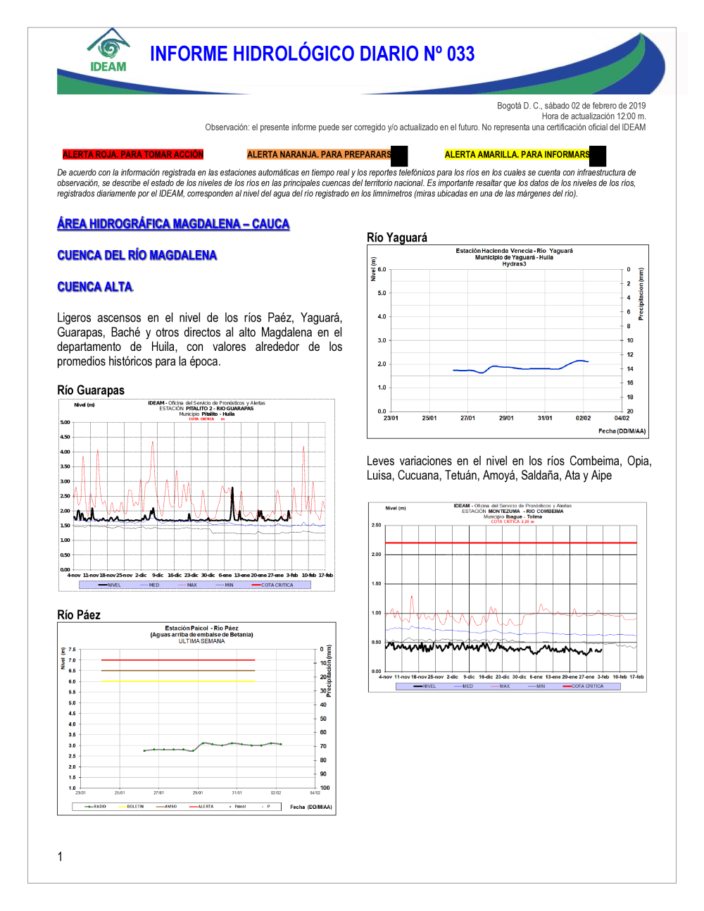 En general, el seguimiento que hace el Ideam del comportamiento hidrológico en los principales ríos del país se realiza con la información horaria en tiempo real que se recibe de las estaciones automáticas, complementadas con más de 40 estaciones hidrológicas que transmiten en las primeras horas cada mañana, los 365 días del año.
