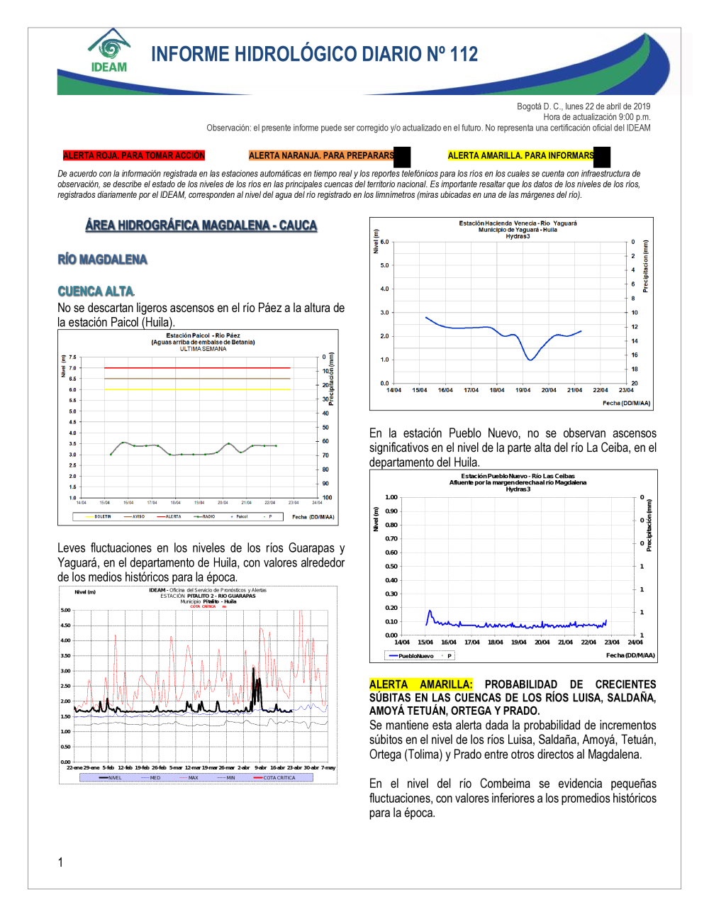 En general, el seguimiento que hace el Ideam del comportamiento hidrológico en los principales ríos del país se realiza con la información horaria en tiempo real que se recibe de las estaciones automáticas, complementadas con más de 40 estaciones hidrológicas que transmiten en las primeras horas cada mañana, los 365 días del año.