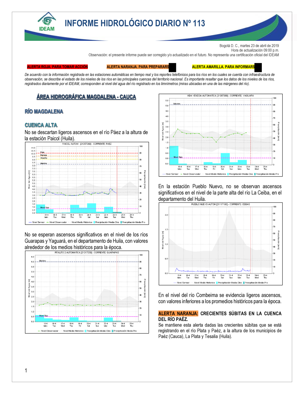 En general, el seguimiento que hace el Ideam del comportamiento hidrológico en los principales ríos del país se realiza con la información horaria en tiempo real que se recibe de las estaciones automáticas, complementadas con más de 40 estaciones hidrológicas que transmiten en las primeras horas cada mañana, los 365 días del año.