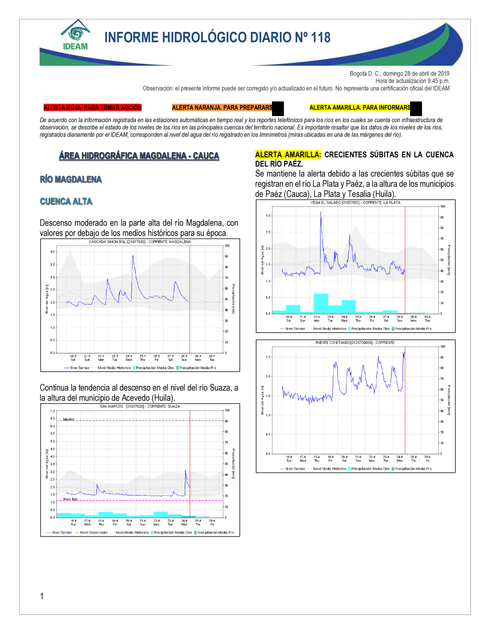 En general, el seguimiento que hace el Ideam del comportamiento hidrológico en los principales ríos del país se realiza con la información horaria en tiempo real que se recibe de las estaciones automáticas, complementadas con más de 40 estaciones hidrológicas que transmiten en las primeras horas cada mañana, los 365 días del año.
