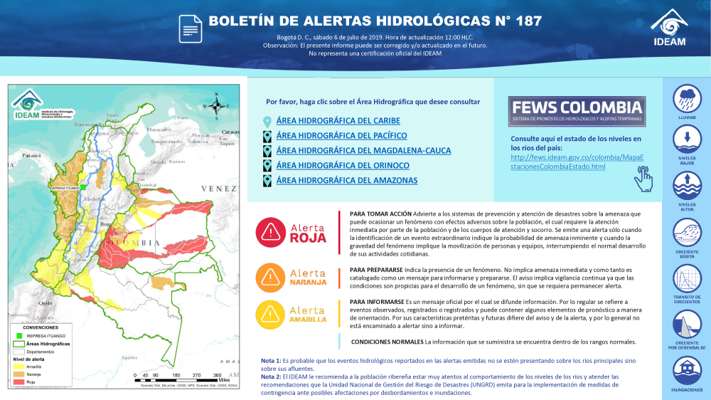 En general, el seguimiento que hace el Ideam del comportamiento hidrológico en los principales ríos del país se realiza con la información horaria en tiempo real que se recibe de las estaciones automáticas, complementadas con más de 40 estaciones hidrológicas que transmiten en las primeras horas cada mañana, los 365 días del año.