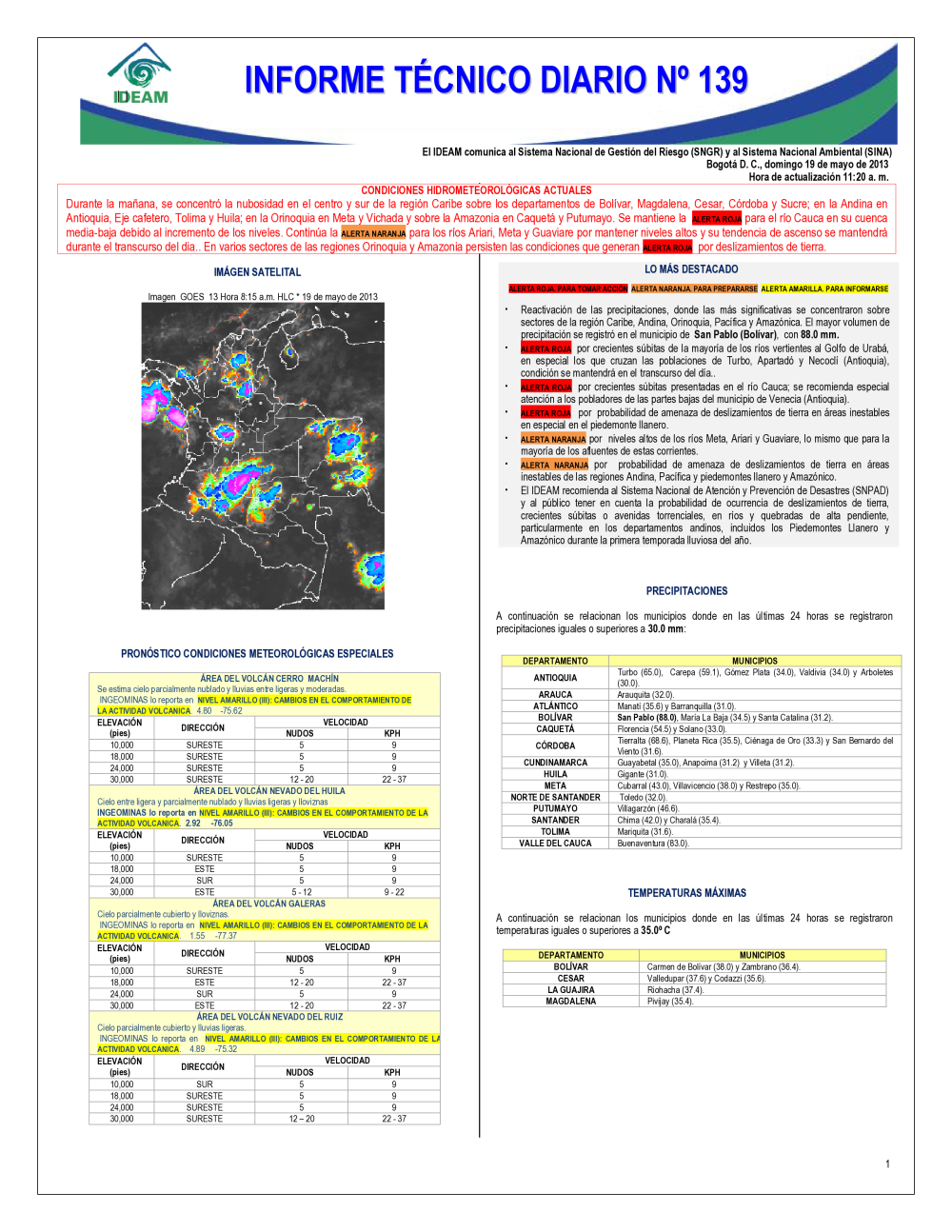 El IDEAM, pone a disposición del Sistema Nacional para la Prevención y Atención de Desastres (SNPAD), el Sistema Nacional Ambiental (SINA) y la comunidad en general, el informe técnico diario de alertas ambientales de origen hidrometeorológico; de Igual manera, se pueden consultar los informes anteriores. En caso de eventos extraordinarios que puedan ser detectados por nuestra red ambiental, se publicará un comunicado especial. Se debe tener en cuenta que esta es una información indicativa de orden nacional; para situaciones puntuales favor remitirse a los comunicados que emitan los Comités Locales y Regionales de Prevención y Atención de Desastres.