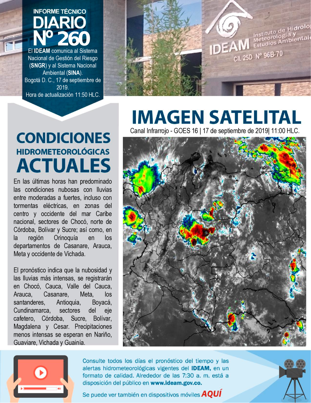 El IDEAM, pone a disposición del Sistema Nacional para la Prevención y Atención de Desastres (SNPAD), el Sistema Nacional Ambiental (SINA) y la comunidad en general, el informe técnico diario de alertas ambientales de origen hidrometeorológico; de Igual manera, se pueden consultar los informes anteriores. En caso de eventos extraordinarios que puedan ser detectados por nuestra red ambiental, se publicará un comunicado especial. Se debe tener en cuenta que esta es una información indicativa de orden nacional; para situaciones puntuales favor remitirse a los comunicados que emitan los Comités Locales y Regionales de Prevención y Atención de Desastres.