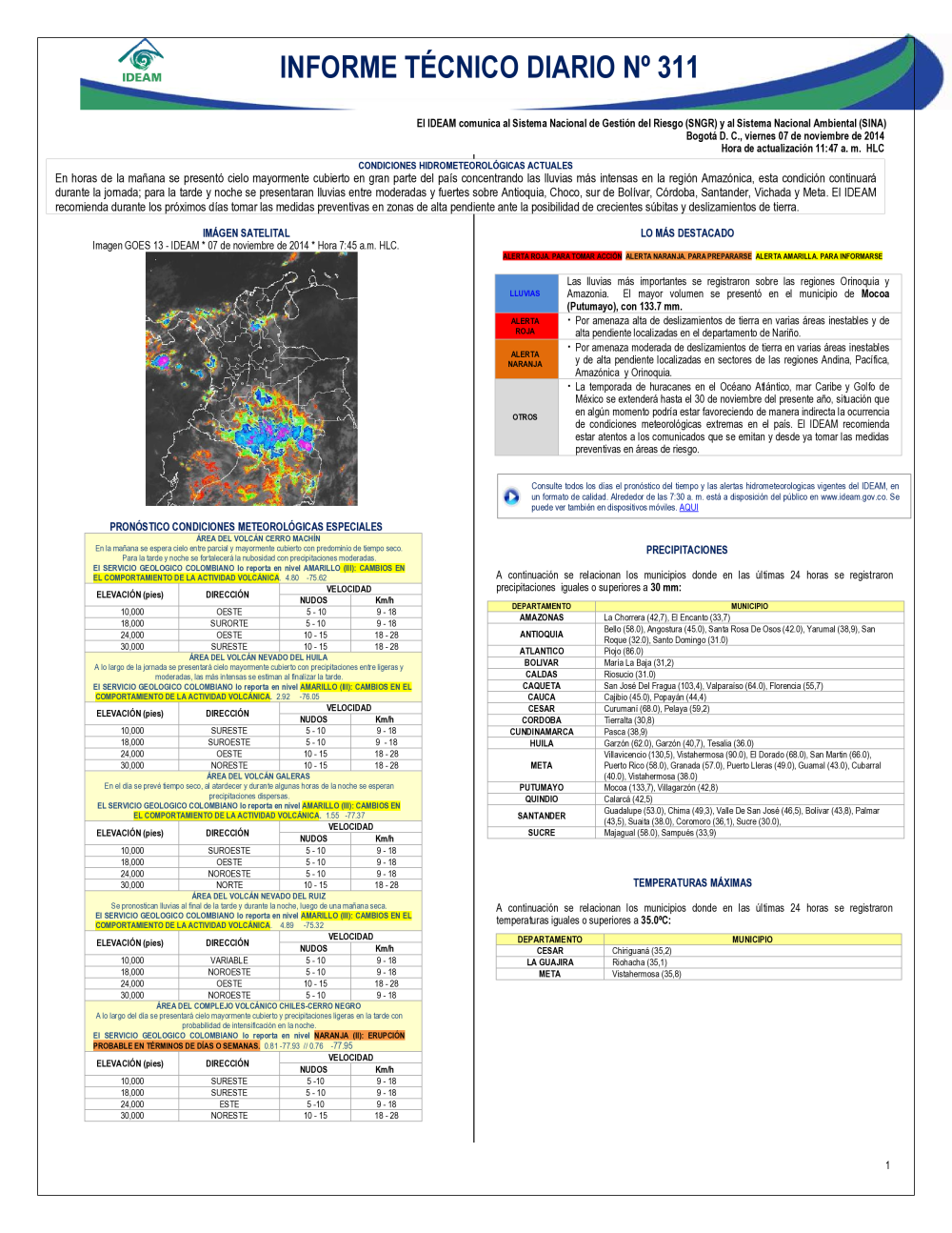 El IDEAM, pone a disposición del Sistema Nacional para la Prevención y Atención de Desastres (SNPAD), el Sistema Nacional Ambiental (SINA) y la comunidad en general, el informe técnico diario de alertas ambientales de origen hidrometeorológico; de Igual manera, se pueden consultar los informes anteriores. En caso de eventos extraordinarios que puedan ser detectados por nuestra red ambiental, se publicará un comunicado especial. Se debe tener en cuenta que esta es una información indicativa de orden nacional; para situaciones puntuales favor remitirse a los comunicados que emitan los Comités Locales y Regionales de Prevención y Atención de Desastres.