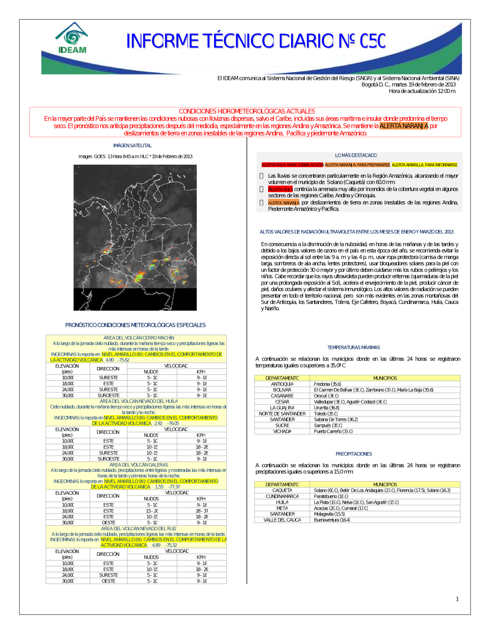 El IDEAM, pone a disposición del Sistema Nacional para la Prevención y Atención de Desastres (SNPAD), el Sistema Nacional Ambiental (SINA) y la comunidad en general, el informe técnico diario de alertas ambientales de origen hidrometeorológico; de Igual manera, se pueden consultar los informes anteriores. En caso de eventos extraordinarios que puedan ser detectados por nuestra red ambiental, se publicará un comunicado especial. Se debe tener en cuenta que esta es una información indicativa de orden nacional; para situaciones puntuales favor remitirse a los comunicados que emitan los Comités Locales y Regionales de Prevención y Atención de Desastres.