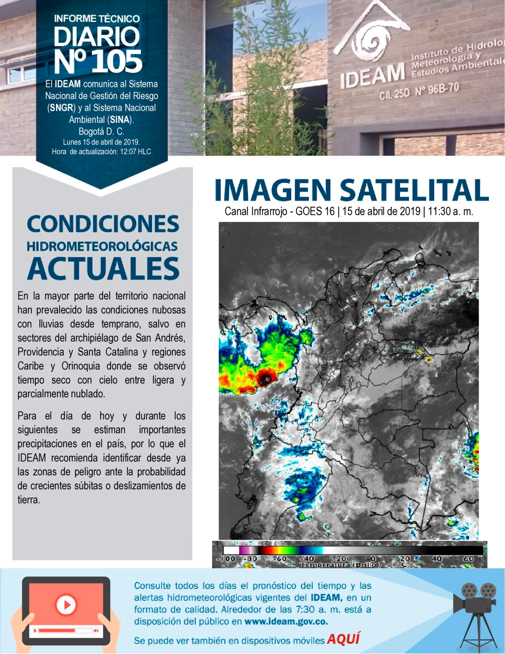 El IDEAM, pone a disposición del Sistema Nacional para la Prevención y Atención de Desastres (SNPAD), el Sistema Nacional Ambiental (SINA) y la comunidad en general, el informe técnico diario de alertas ambientales de origen hidrometeorológico; de Igual manera, se pueden consultar los informes anteriores. En caso de eventos extraordinarios que puedan ser detectados por nuestra red ambiental, se publicará un comunicado especial. Se debe tener en cuenta que esta es una información indicativa de orden nacional; para situaciones puntuales favor remitirse a los comunicados que emitan los Comités Locales y Regionales de Prevención y Atención de Desastres.