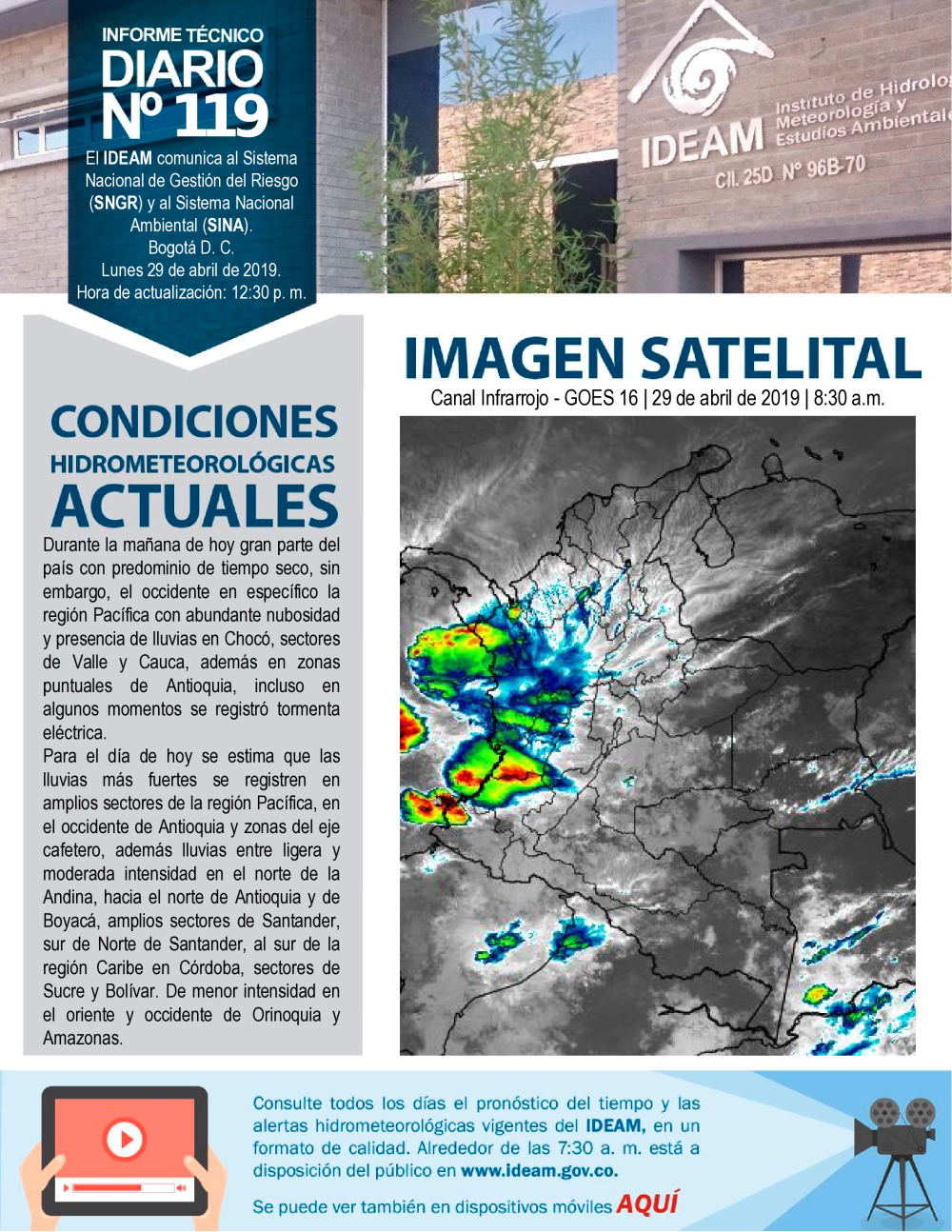El IDEAM, pone a disposición del Sistema Nacional para la Prevención y Atención de Desastres (SNPAD), el Sistema Nacional Ambiental (SINA) y la comunidad en general, el informe técnico diario de alertas ambientales de origen hidrometeorológico; de Igual manera, se pueden consultar los informes anteriores. En caso de eventos extraordinarios que puedan ser detectados por nuestra red ambiental, se publicará un comunicado especial. Se debe tener en cuenta que esta es una información indicativa de orden nacional; para situaciones puntuales favor remitirse a los comunicados que emitan los Comités Locales y Regionales de Prevención y Atención de Desastres.