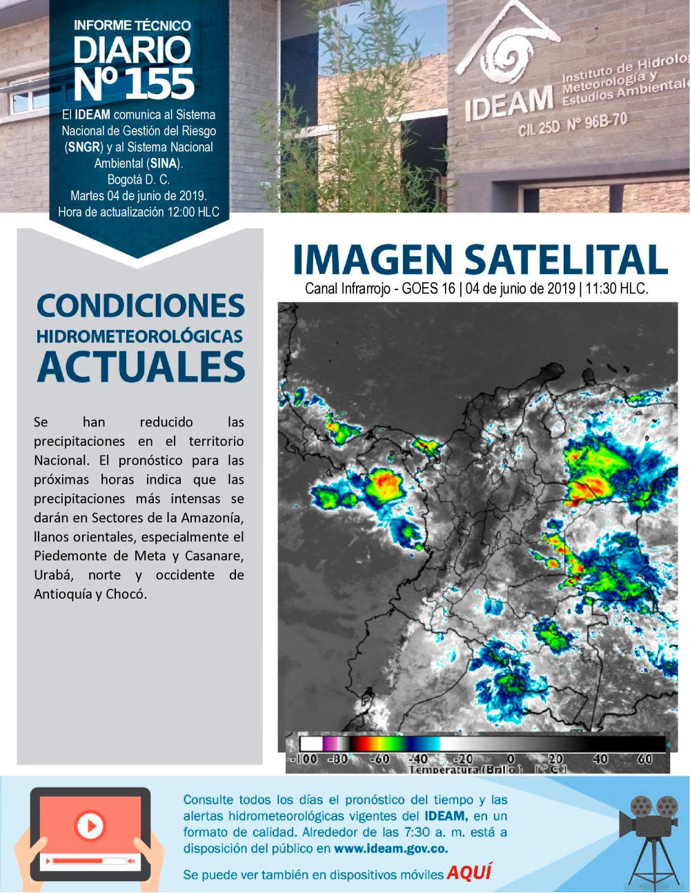 El IDEAM, pone a disposición del Sistema Nacional para la Prevención y Atención de Desastres (SNPAD), el Sistema Nacional Ambiental (SINA) y la comunidad en general, el informe técnico diario de alertas ambientales de origen hidrometeorológico; de Igual manera, se pueden consultar los informes anteriores. En caso de eventos extraordinarios que puedan ser detectados por nuestra red ambiental, se publicará un comunicado especial. Se debe tener en cuenta que esta es una información indicativa de orden nacional; para situaciones puntuales favor remitirse a los comunicados que emitan los Comités Locales y Regionales de Prevención y Atención de Desastres.