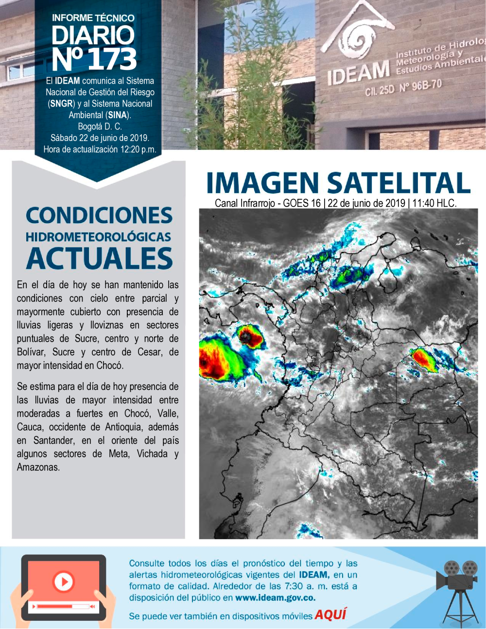 El IDEAM, pone a disposición del Sistema Nacional para la Prevención y Atención de Desastres (SNPAD), el Sistema Nacional Ambiental (SINA) y la comunidad en general, el informe técnico diario de alertas ambientales de origen hidrometeorológico; de Igual manera, se pueden consultar los informes anteriores. En caso de eventos extraordinarios que puedan ser detectados por nuestra red ambiental, se publicará un comunicado especial. Se debe tener en cuenta que esta es una información indicativa de orden nacional; para situaciones puntuales favor remitirse a los comunicados que emitan los Comités Locales y Regionales de Prevención y Atención de Desastres.
