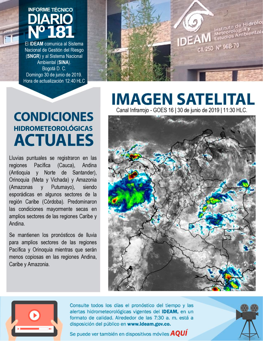El IDEAM, pone a disposición del Sistema Nacional para la Prevención y Atención de Desastres (SNPAD), el Sistema Nacional Ambiental (SINA) y la comunidad en general, el informe técnico diario de alertas ambientales de origen hidrometeorológico; de Igual manera, se pueden consultar los informes anteriores. En caso de eventos extraordinarios que puedan ser detectados por nuestra red ambiental, se publicará un comunicado especial. Se debe tener en cuenta que esta es una información indicativa de orden nacional; para situaciones puntuales favor remitirse a los comunicados que emitan los Comités Locales y Regionales de Prevención y Atención de Desastres.