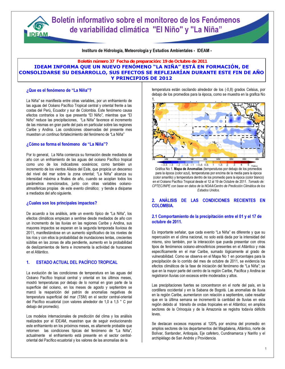 BOLETÍN DE MONITOREO FENOMENO EL NIÑO Y LA NIÑA