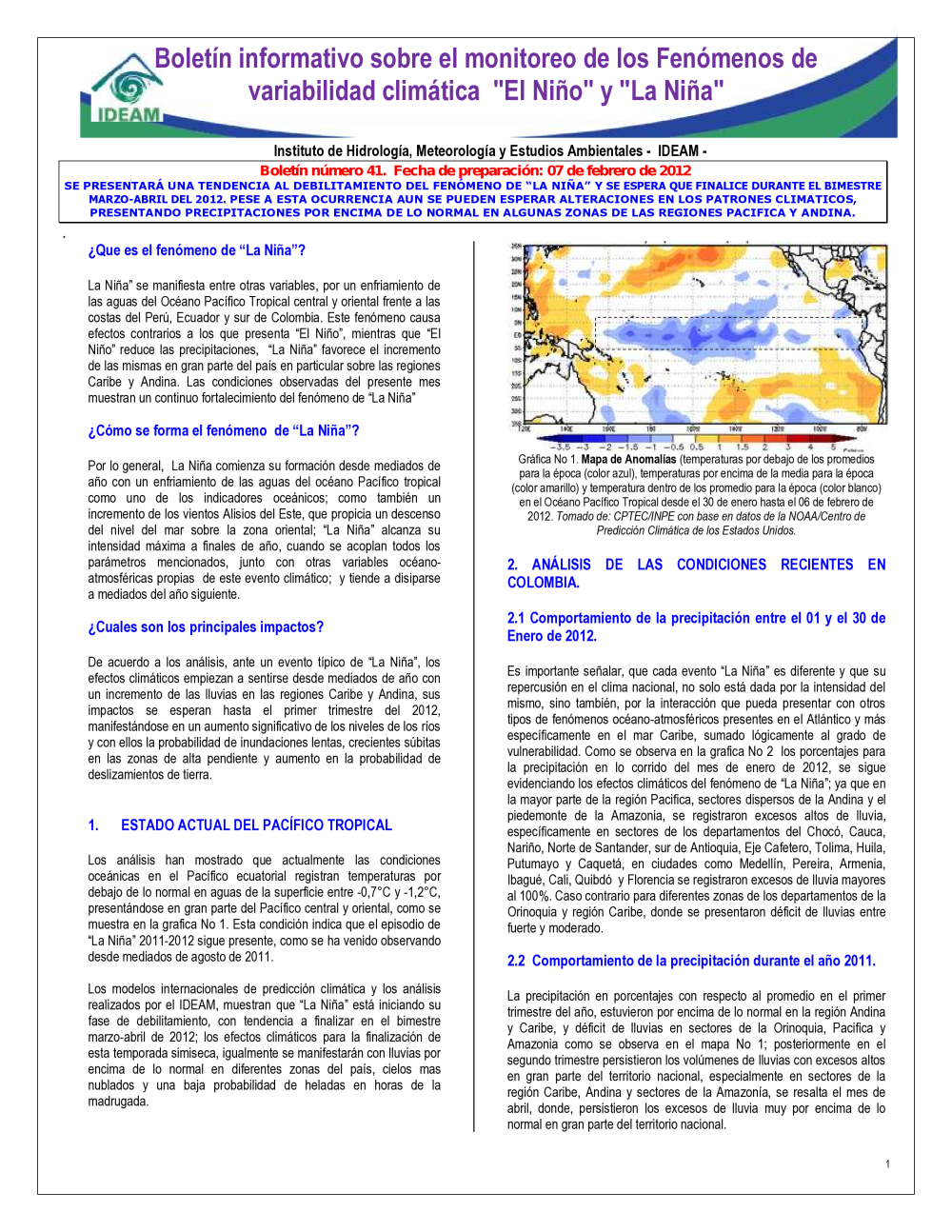 BOLETÍN DE MONITOREO FENOMENO EL NIÑO Y LA NIÑA