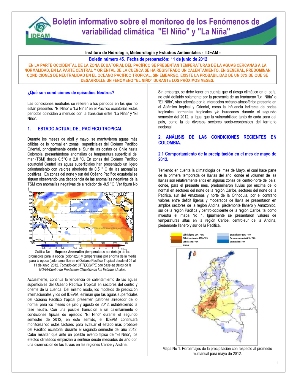 BOLETÍN DE MONITOREO FENOMENO EL NIÑO Y LA NIÑA