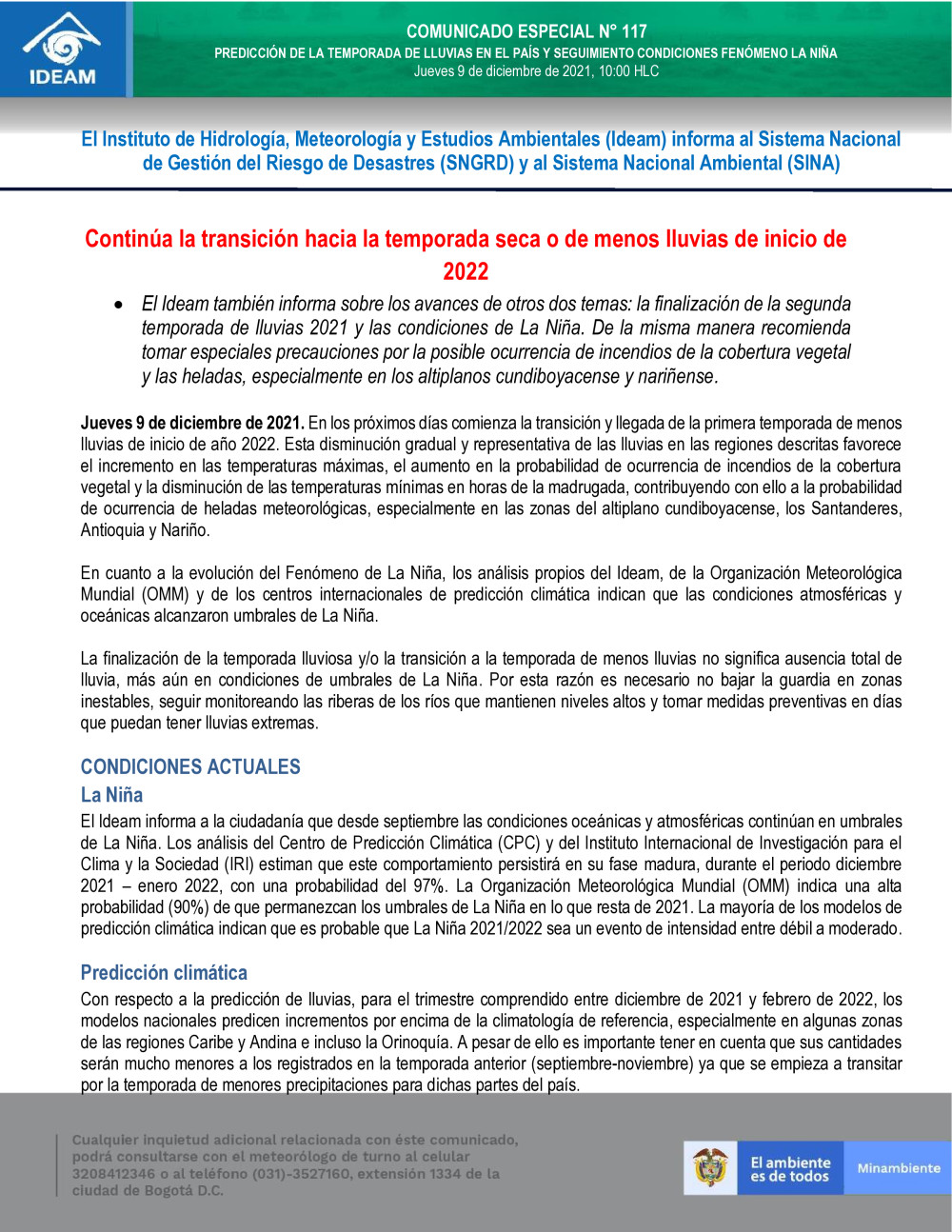 COMUNICADO ESPECIAL No. 117 TEMPORADA MENOS LLUVIAS Y SEGUIMIENTO ENOS