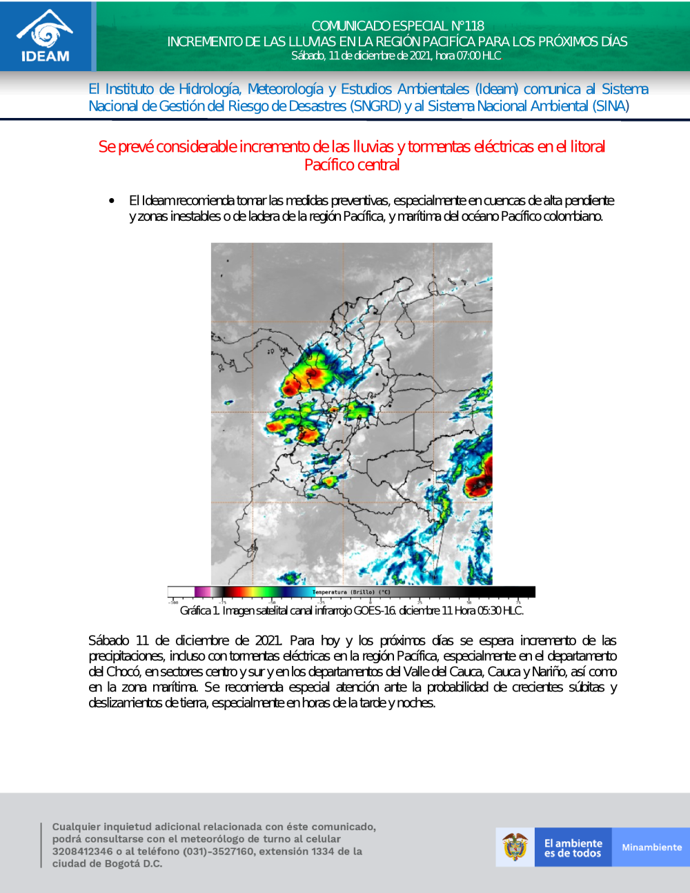 COMUNICADO ESPECIAL N°118 INCREMENTO DE LLUVIAS EL EL LITORAL PACIFICO CENTRAL