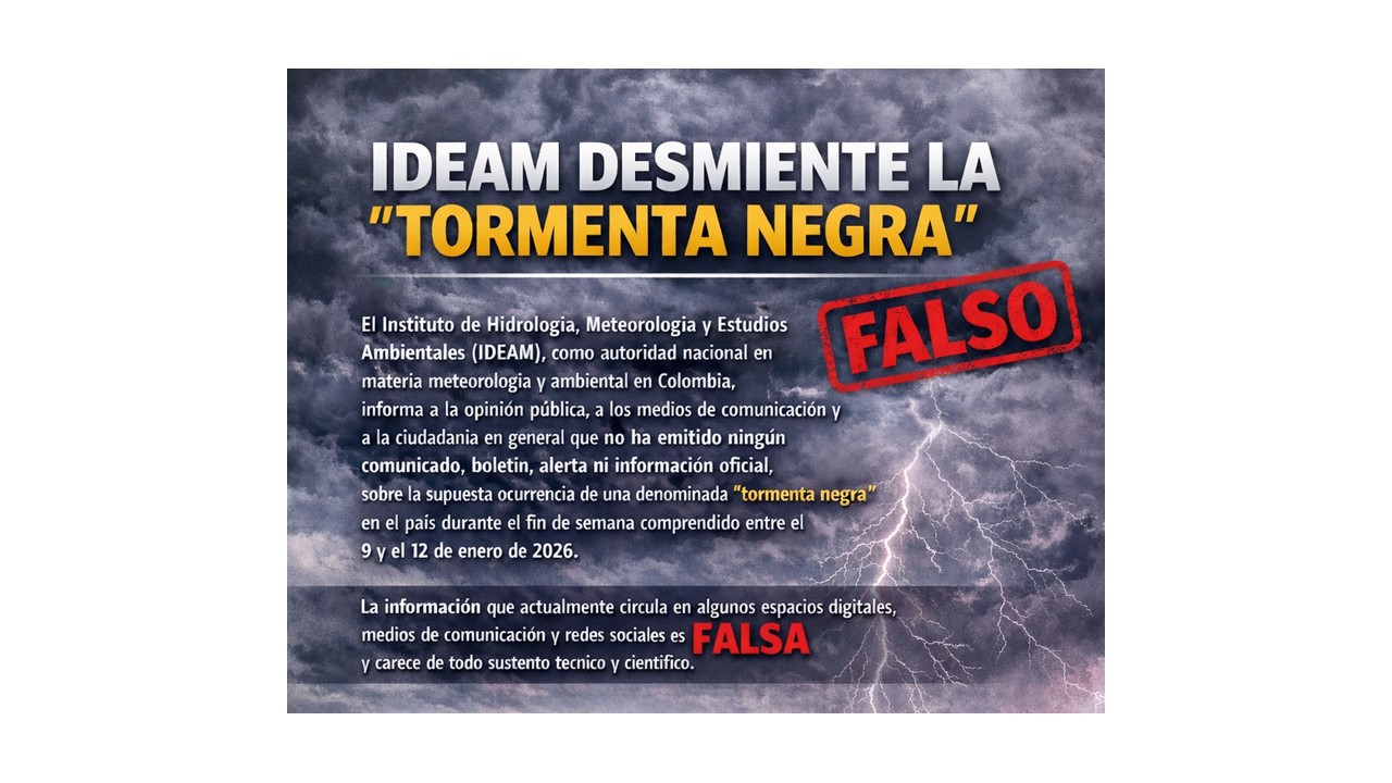 El Instituto de Hidrología, Meteorología y Estudios Ambientales (Ideam), como autoridad nacional en materia meteorológica y ambiental en Colombia, informa a la opinión pública, a los medios de comunicación y a la ciudadanía en general que no ha emitido ningún comunicado, boletín, alerta ni información oficial, a través de sus canales institucionales, sobre la supuesta ocurrencia de una denominada “tormenta negra” en el país durante el fin de semana comprendido entre el 9 y el 12 de enero de 2026.