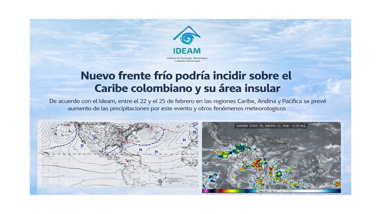 El Sistema Nacional de Gestión del Riesgo de Desastres (@SNGRDColombia) informa sobre el paso de un nuevo frente frío sobre el mar Caribe colombiano que podría generar un incremento de lluvias, en la intensidad de los vientos y en la altura del oleaje entre el 22 y el 26 de febrero.